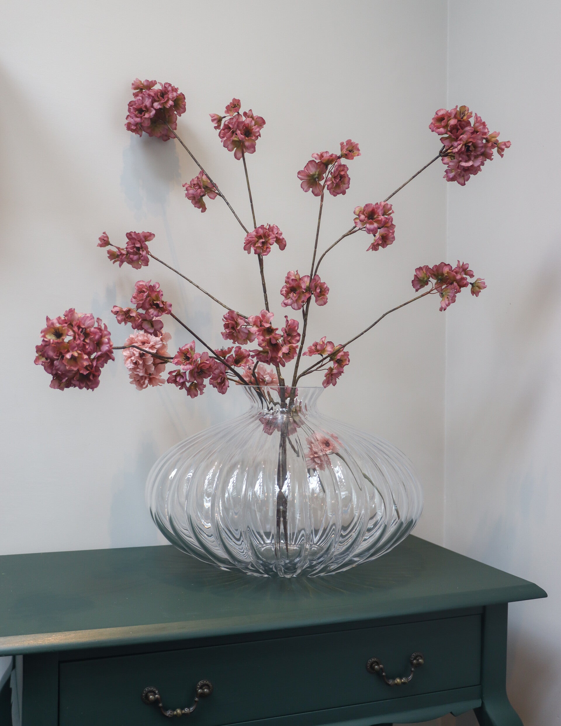 Wil jij een eyecatcher in huis? Deze vaas in een musthave voor in elk interieur! Niet alleen mooi maar ook tijdloos! Vaas pumpkin heeft een mooi groot formaat en is van luxe dik glas. Zet er een van onze mooie zijde boeketten in of een combinatie van onze twee kleuren bloesemtakken en het plaatje is compleet!